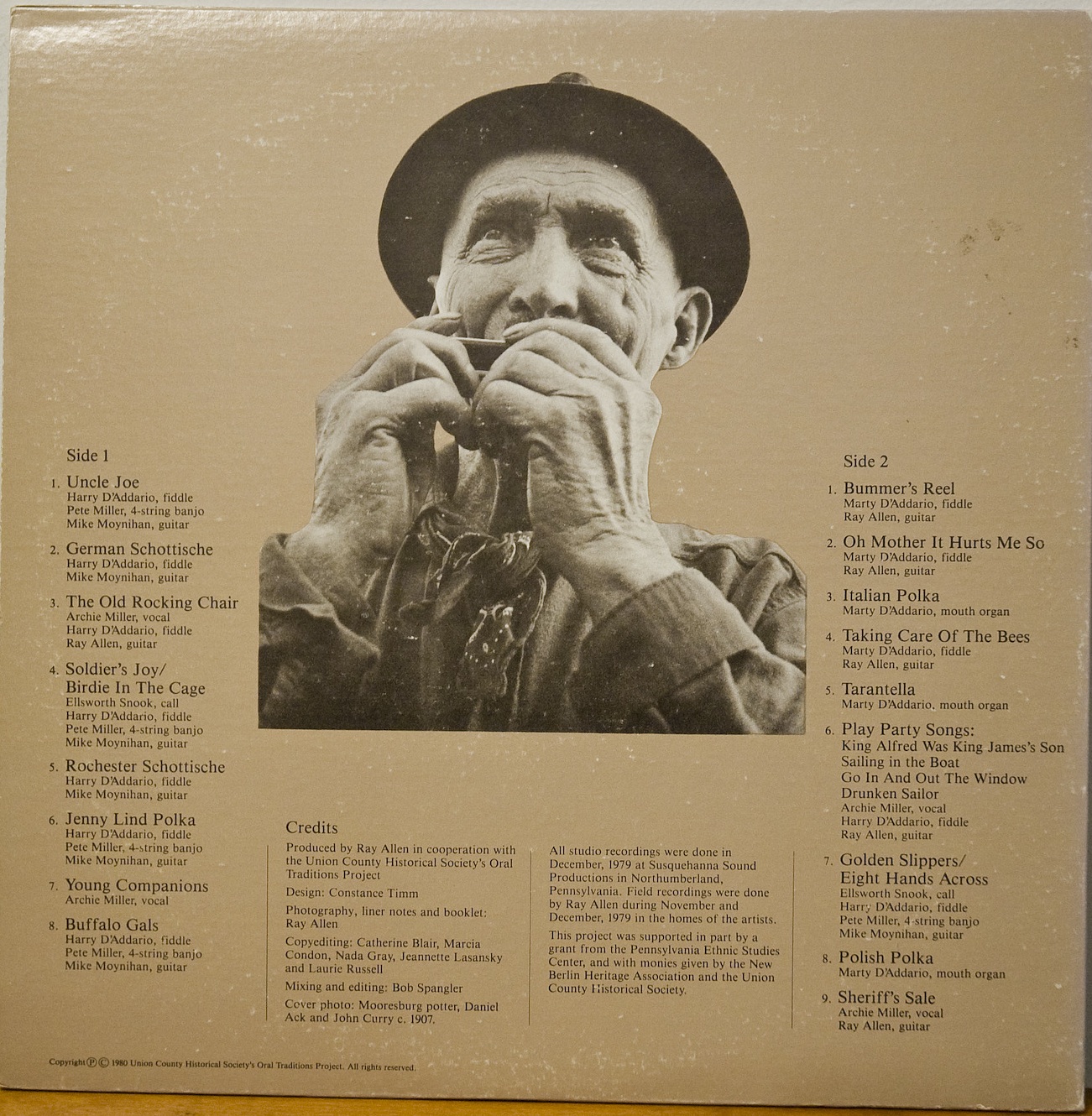 This record is great! Its a collection of fiddle, harmonica and vocal music (sometimes accompanied by 4-string banjo and guitar) from central Pennsylvania recorded by Ray Allen in 1979 and originally released by the Union County Historical Society’s Oral Traditions Project. This is not your typical “old-time music;” the musicians represented here are the decedents not only of early Scots-Irish settlers, but also of immigrants from Germany and Italy and the songs and tunes they play reflect that in a wonderful way. Great stuff! And I love that cover photo.